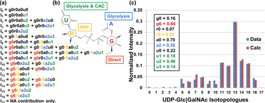 Figure 1: (a) Chemical substructure model representing the possible number of 13C incorporation from 13C6-Glc tracer into UDP-GlcNAc, accounting for the observed FT-ICR-MS isotopologue peaks. (b) Structure of UDP-GlcNAc annotated by its chemical substructures and their biosynthetic pathways from 13C6-Glc, as in Fig. 2. U = uracil, R = ribose, A = acetyl, G=glucose. NAc-Glucose utilizes Gln as the nitrogen donor. (c) Fit of optimized chemical substructure model parameters to FT-ICR-MS isotopologue data of UDP-GlcNAc extracted from a LN3 prostate cancer cell culture after 48 hours of growth in 13C6-Glc. |