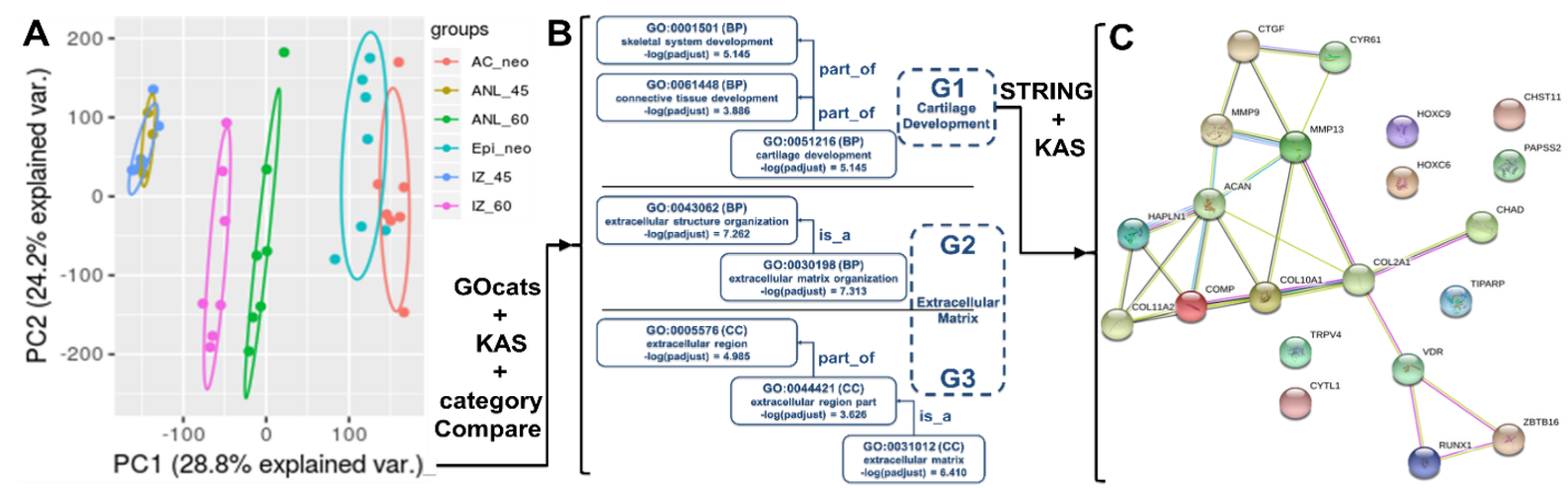 Figure 2. A) PCA plot of equine RNAseq datasets. B) Organized groups of enriched GO-terms for PC1. C) STRING interactions between high PC1 loading gene(-product)s annotated with group G1 GO terms (cartilage development). |